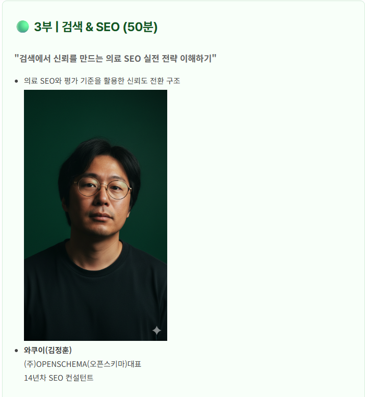 ソウルビディ歯科の文石俊代表院長の招待により、オープンスキーマのワクイが2026年1月31日に開催される。 数十名の病院院長を対象にSEOセミナーを開催することができました。 このセミナーでは、院長が業者を選ぶ際に、その業者がSEOについて理解しているか、あるいは口だけでうまくやっているかを判断する基準を説明し、同時に韓国で話題となっているSEOとGEOの明確な違いと実情についても案内しました。